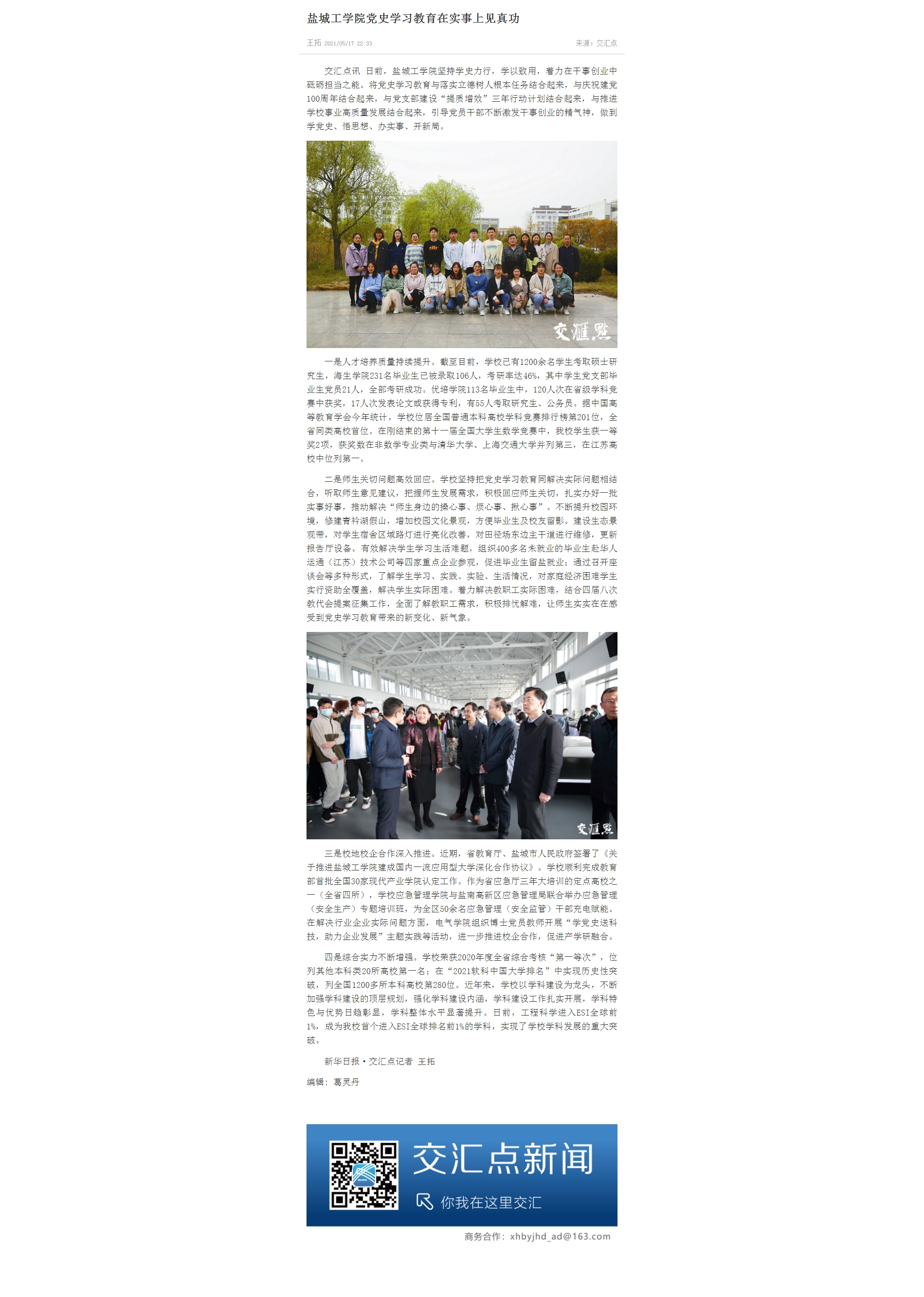 三是校地校企合作深入推进。近期,省教育厅、盐城市人民政府签署了《关于推进bb贝博艾弗森官方网站建成国内一流应用型大学深化合作协议》。学校顺利完成教育部首批全国30家现代产业学院认定工作。作为省应急厅三年大培训的定点高校之一(全省四所),学校应急管理学院与盐南高新区应急管理局联合举办应急管理(安全生产)专题培训班,为全区50余名应急管理(安全监管)干部充电赋能。在解决行业企业实际问题方面,电气学院组织博士党员教师开展“学党史送科技,助力企业发展”主题实践等活动,进一步推进校企合作,促进产学研融合。