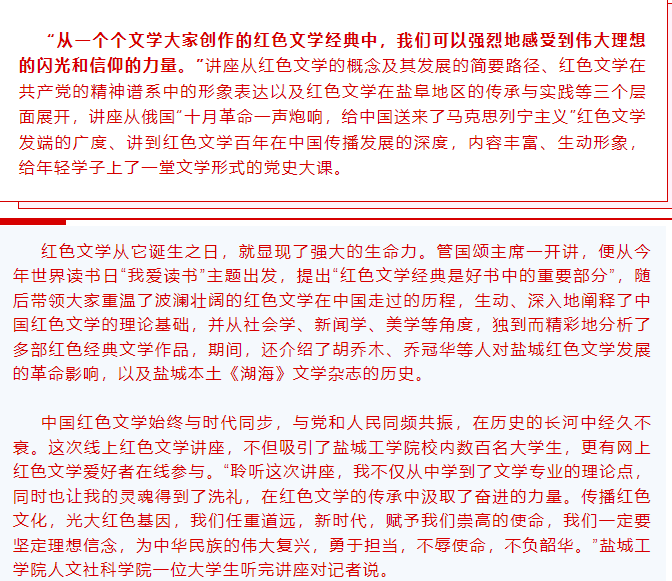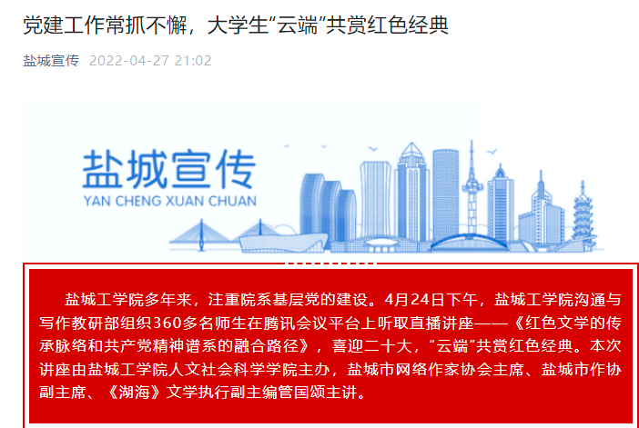 盐城宣传微信平台报道贝博党建工作常抓不懈,大学生“云端”共赏红色经典