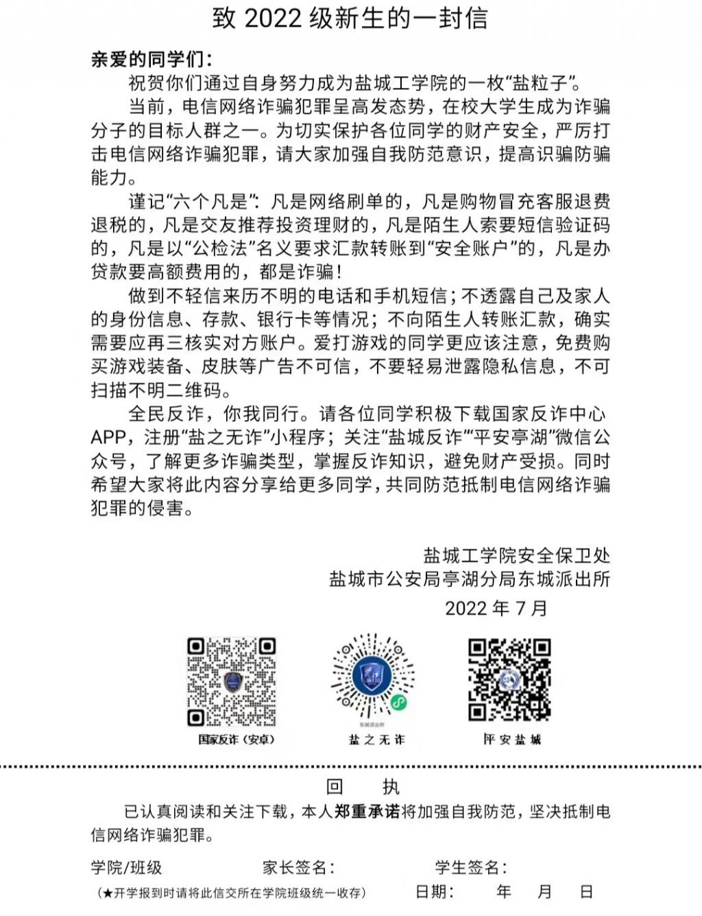 现代快报讯(通讯员 箫剑 潘霖 记者 姜振军)" 亲爱的同学,祝贺你通过自身努力,成为bb贝博艾弗森官方网站的一枚‘盐粒子’。当前,通讯网络诈骗呈高发态势,在校大学生成为诈骗分子的目标人群之一 ……"" 谨记六个‘凡是’:凡是网络刷单的,凡是购物冒充客服退费退税的 ……" 近日,盐城一高校的准大学生们在收到大学录取通知书的同时,还收到了一份意义非凡的《致 2022 级新生的一封信》。