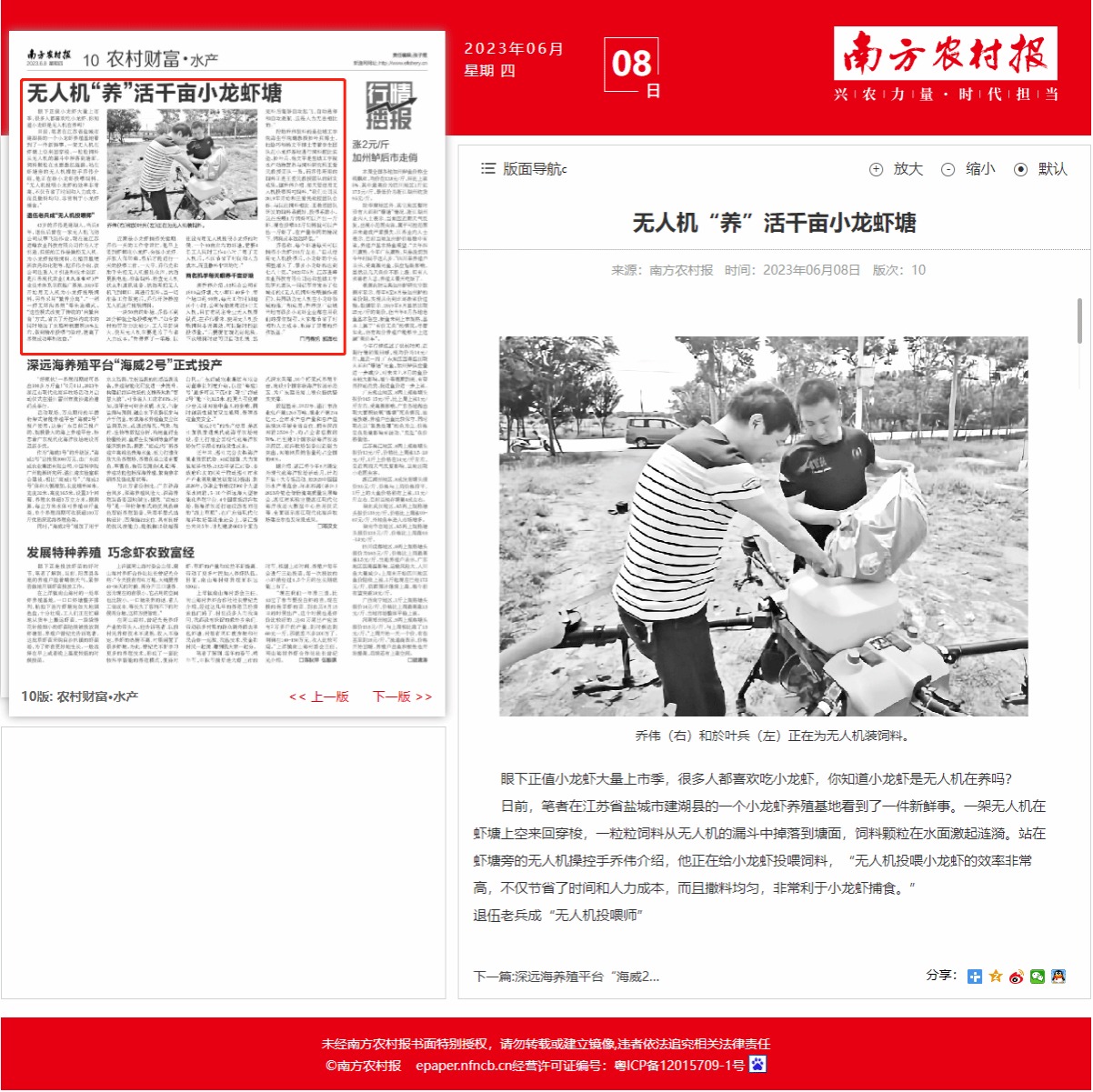 乔伟称,每个虾塘每天可以捕捞小龙虾200斤左右,“自从使用无人机投喂后,小龙虾的个头明显增大了,很多小龙虾都达到七八十克。”2022年5月,江苏进峰农业科技有限公司还和bb贝博艾弗森官方网站研究团队一同起草并发布了盐城市的《无人机饲料投喂操作规程》,共同助力无人机在小龙虾领域的推广和应用。乔伟说:“盐城当地有很多小龙虾企业都在用我们的操作规程,大家都节省了时间和人力成本,取得了显著的经济效益。”
