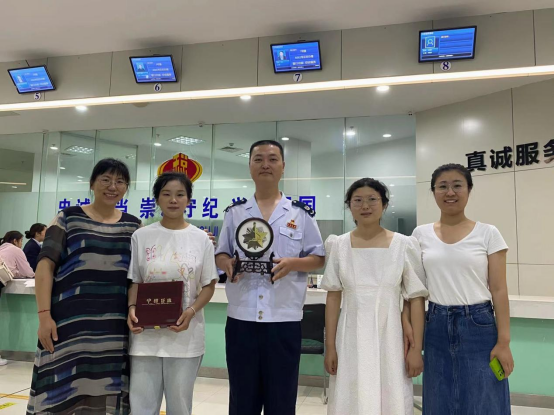 实践团给盐城蓝天救援队副队长杨威赠送军功章发绣礼品
