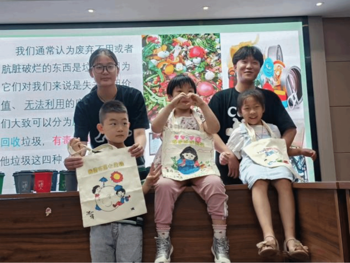实践团针对儿童开展垃圾分类趣味科普课堂。在成员们绘声绘色的图文讲解和实物演示下,孩子们深入了解垃圾的分类、回收和再利用过程,小朋友们在帮助与引导下成功完成了多种常见垃圾的分类,并用画笔在帆布袋上绘出了自己心里的地球家园,展现出了孩子们对美好生活环境的向往。在充满乐趣的学习过程中,孩子们表现出积极的学习兴趣,同时也深刻意识到世界正处于危急的资源紧缺状态,提出要带动身边家长与同学们一起参与到垃圾分类中来,让更多人意识到资源的有限性。