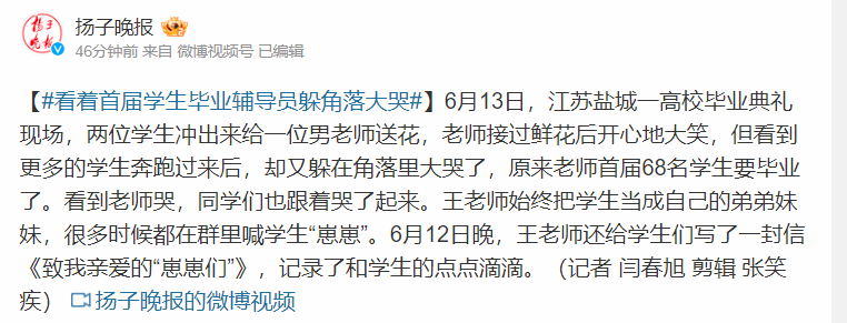 【扬子晚报微博】看看首届学生毕业辅导员躲角落大哭