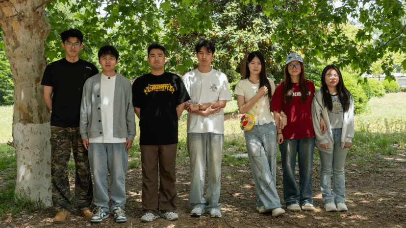 考上211学校的7位同学在校园里留影