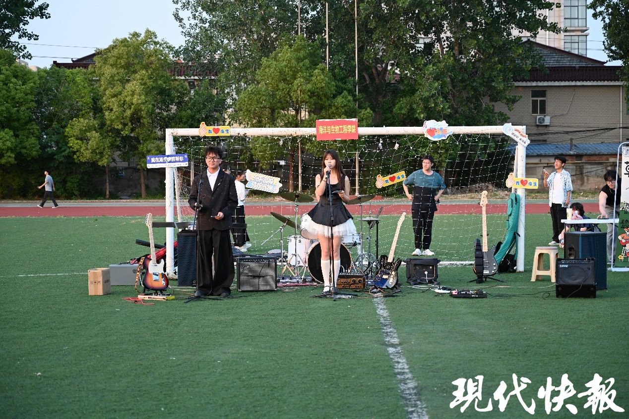 夜幕降临,足球场的草坪上灯光璀璨。开场舞《Know about me》、歌曲《鲜花》《海阔天空》《挪威的森林》《舍得》《融化》《我乘着风飞过来》、舞蹈《midas touch》……校园乐队、歌手和舞者轮番登台,用精彩的表演传递对毕业生的祝福。
