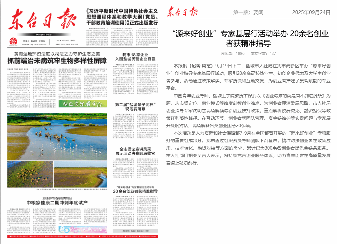 本报讯(记者 周宴)9月19日下午,盐城市人社局在我市高新区举办“源来好创业”创业指导专家基层行活动,吸引20余名高校毕业生、初创企业代表及大学生创业者参与。活动通过政策解读、专家授课和互动交流,为创业者搭建了集智赋能的专业平台。