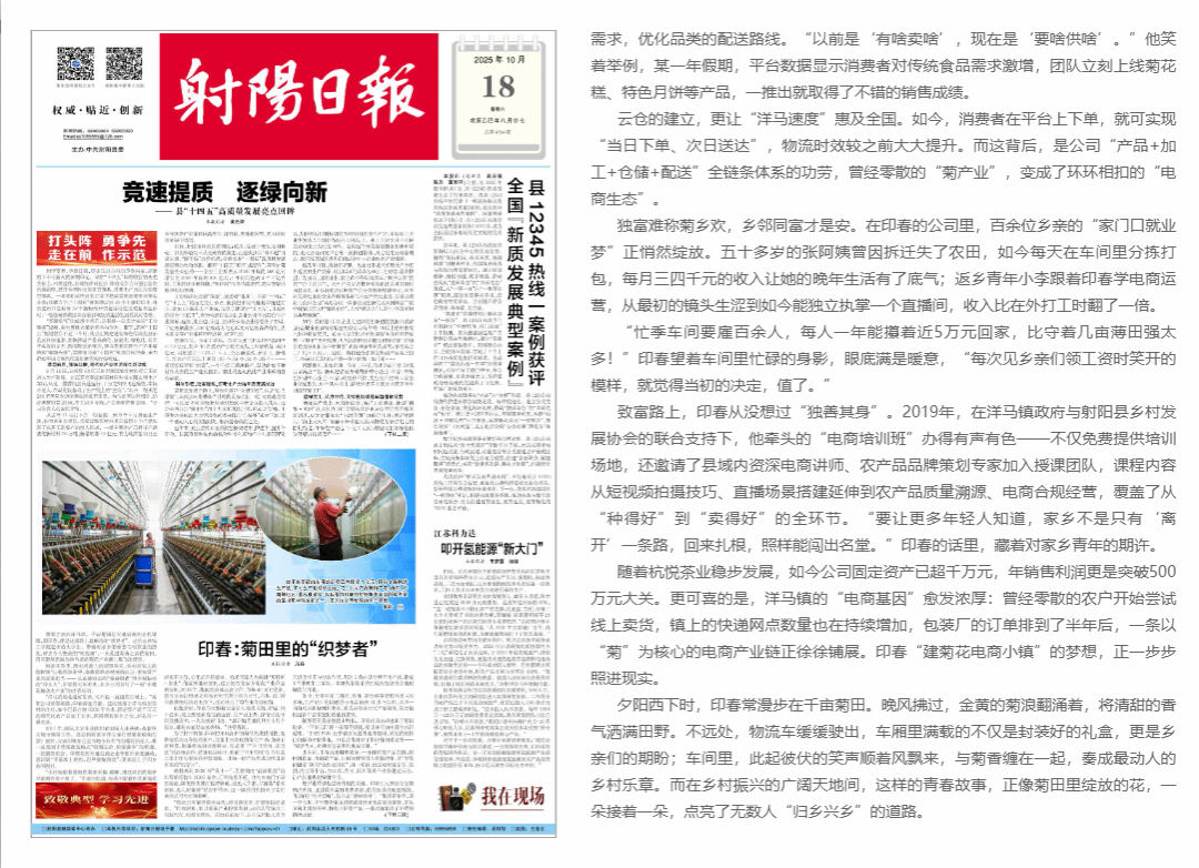 随着杭悦茶业稳步发展,如今公司固定资产已超千万元,年销售利润更是突破500万元大关。更可喜的是,洋马镇的“电商基因”愈发浓厚:曾经零散的农户开始尝试线上卖货,镇上的快递网点数量也在持续增加,包装厂的订单排到了半年后,一条以“菊”为核心的电商产业链正徐徐铺展。印春“建菊花电商小镇”的梦想,正一步步照进现实。