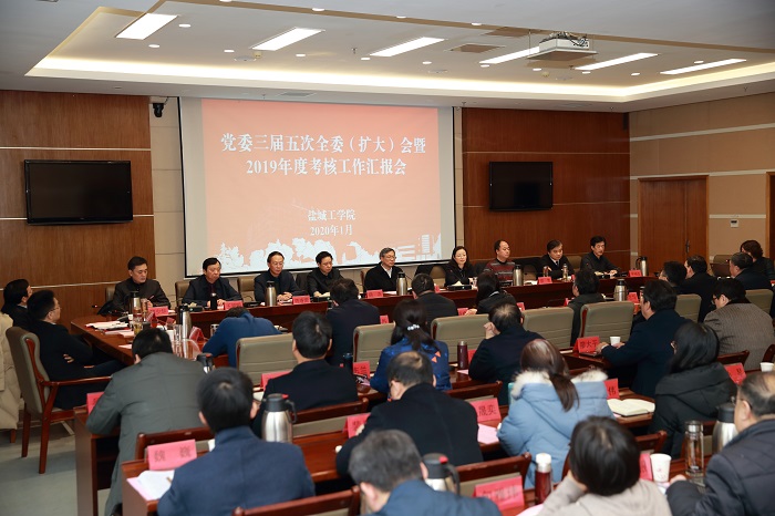 刘祖汉充分肯定了全校各部门各单位2019年工作中取得的成绩。他指出, 在习近平新时代中国特色社会主义思想指引下,全校师生员工迎难而上,把大事办好、好事办实、难事办成,创造了不平凡的业绩。对做好2020年工作,他要求全校上下一要牢固树立机遇意识,坚定走高质量发展之路。刘祖汉强调,面对新时代高等教育的新任务新要求,我们要思考反思盐工的坐标和机会,以服务为使命,以改革为动力,全面推进一流应用型本科教育,大力推动高水平师资队伍建设,坚持“应用型”方向不变、“产教融合”道路不偏、“校地合作”力度不减,努力提升科技创新能力和服务经济社会发展水平,推动学校高质量发展再上新台阶。二要明确重点任务,提升内涵发展水平。他强调,我们要重点围绕全面加强党的建设、立德树人、学科和学位点建设、一流专业和一流课程建设、高层次人才队伍、科研创新、科技服务、国际交流合作、社会培训等方面工作重点发力,争取有新的突破。三要认真总结“十三五”,积极谋划“十四五”。要对照“十三五”事业发展规划,认真总结,查漏补缺,确保各项目标任务圆满完成;要提前思考、积极谋划,为学校长远发展把舵导航。
