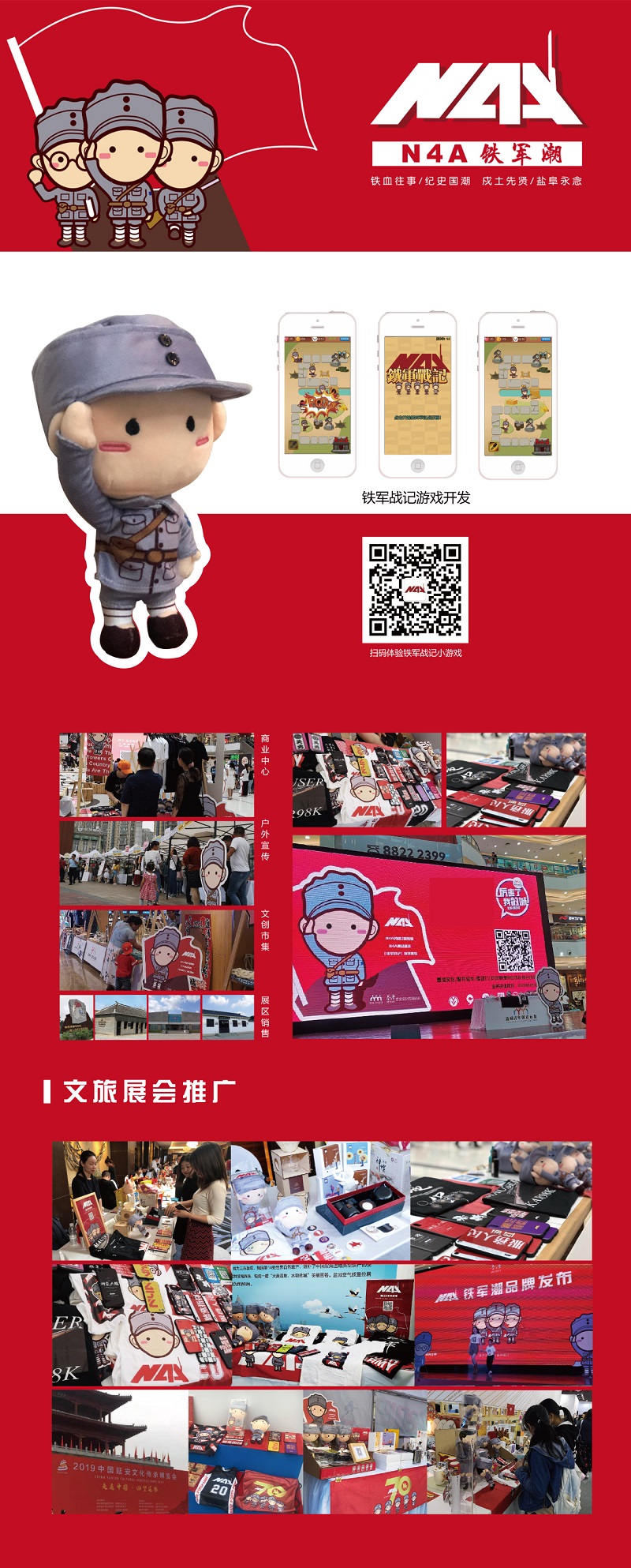 “N4A铁军潮”文化品牌由贝博设计艺术学院教师、国家级众创空间“摩度空间”发起人、盐城市青年联合会副主席、盐城市众创空间联盟理事长王瑾创立。他指导设计团队用青年人喜闻乐见的表现形式打造了一个创新IP爱国主义文化品牌,在对年轻一代的思维模式、消费观念研究的基础上,设计了一批既能符合现代潮流消费要求,又能服务爱国主义教育的文创产品。“N4A铁军潮”文化品牌传播项目包括了时尚周边、桌面文化、潮流服饰、公仔设计等系列产品和原创漫画的创作,并联合聚龙软件、传动力项目团队协力打造了“铁军战记”小游戏,力求让铁军精神通过互联网新社群文化传播体系的再放光彩。