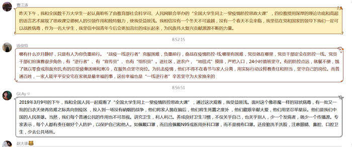思想政治理论课教师侯慧艳认为:“我和学生们一起上了这堂思政大课。这次思政大课信息全面,思想深刻,情感丰沛,在学生中引起了强烈的反响。很多学生边看视频边开始讨论,我所任课班级的研究生同学在群里一直讨论到深夜方才休息。在学生的讨论中,我看到这次战疫给大学生们带来的成长是历史性的。”