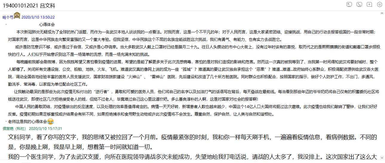 武汉籍研究生吕文科在线跟大家分享了他的战“疫”经历以及心路历程。他说:“作为这场疫情的见证者、亲历者,在危难时刻,我感受到了中华民族的伟大。面对突如其来的疫情,无数国人逆行而上,相信团结勇敢的中国人民很快能够取得最终的胜利!疫情结束以后,欢迎大家来武汉旅游,来感受武汉人民的热情!”