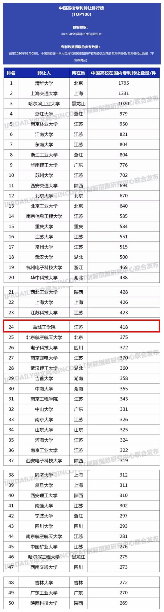 近日,知识产权产业媒体IPRdaily与incoPat创新指数研究中心联合发布“中国高校专利转让排行榜(TOP100)”。据该榜单,截至2020年02月05日,中国高校在中华人民共和国国家知识产权局登记生效的专利申请权/专利权转让数量(不含港澳台),贝博以418件专利转让数位居全国高校第24位。