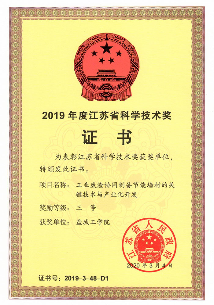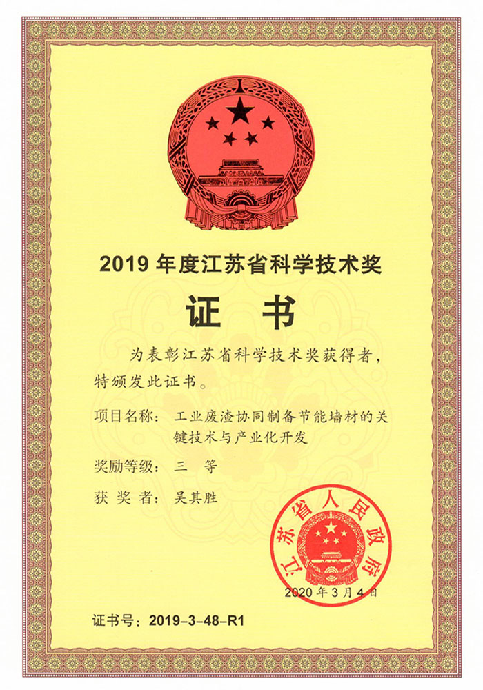 近日,贝博材料学院吴其胜教授科研团队收到获奖证书,其科研团队申报的“工业废渣协同制备节能墙材的关键技术与产业化开发”成果获得2019年度江苏省科学技术三等奖。该成果由bb贝博艾弗森官方网站为第一单位,联合南京工业大学、江苏博拓新型建筑材料有限公司、盐城市鼎力新材料有限公司申报,主要完成人为吴其胜、诸华军、罗乃将、华苏东、张长森、杨涛、徐风广。