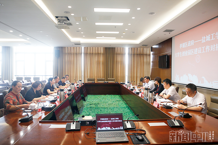 8月26日上午,盐城市亭湖区区长盛艳、副区长朱杰成、亭湖区环保科技城管委会副主任郁荣、政府办主任支云峰、人力资源和保障局局长周亚民等来校交流对接亭湖区政府和bb贝博艾弗森官方网站共建大学生创业园区等工作。校长方海林,党委常委、副校长邵荣,党委常委、宣传部部长韩雅丽和校办、学生处、科技处等部门负责人参加交流会。