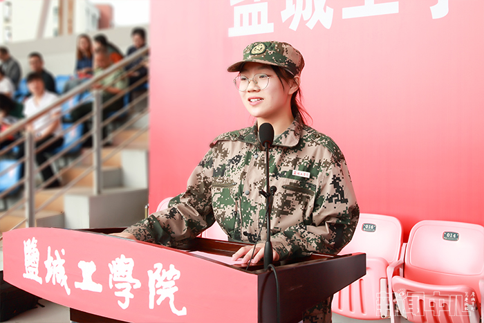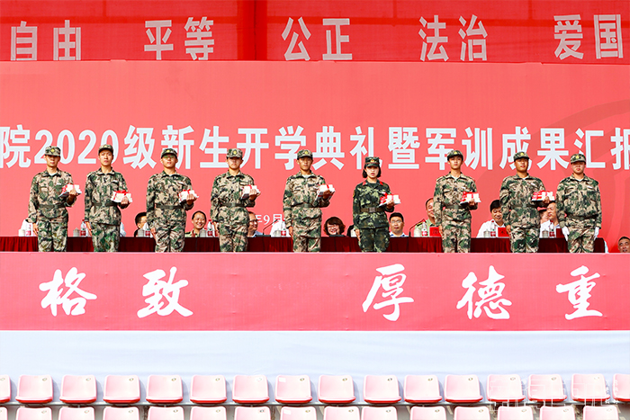 薛浩宣读军训表彰决定。全体校领导为新生代表佩戴校徽、赠送书籍。材料学院2020级材料科学与工程专业陆思雨,“江苏省优秀学生干部”、“江苏省军训之星”获得者、“盐工卫士”队长、汽车学院B车辆171班班长施港伟,省“六大人才高峰”高层次人才、国家侯德榜化工科学技术奖获得者、江苏大学教授、博士生导师、贝博2000级环境工程专业许晖分别代表新生、高年级学生和校友发言。