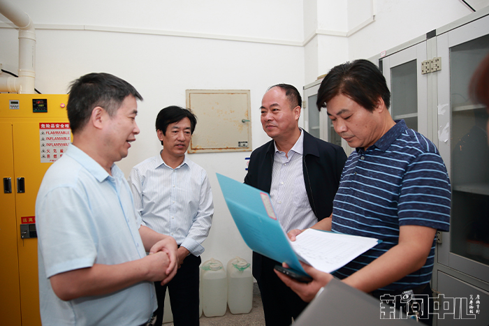 在建军东路校区实验室,校领导一行对实验室的环境与管理、消防设施安全、危化品安全、废气废液处理等问题进行了详细询问,对实验室存在的部分安全隐患提出了整改意见。王资生指出,实验室安全与校园安全、师生生命安全紧密相连,实验设备处和各学院、实验室负责人要进一步强化安全工作主体责任,明确各类人员职责,严格规范操作流程,不断增强师生实验室安全意识,建立实验室安全长效机制。