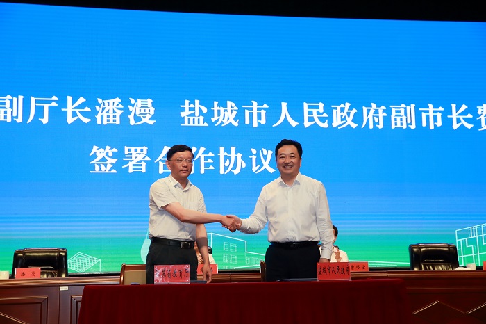 省教育厅副厅长潘漫与盐城市副市长费坚分别代表江苏省教育厅、盐城市人民政府在“关于推进bb贝博艾弗森官方网站建成国内高水平应用型大学的深化合作协议书”上签字。