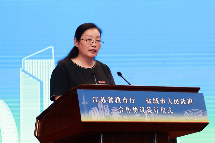方海林代表学校党委、行政,向为盐工发展倾注心血和智慧的江苏省教育厅、盐城市领导,长期来关心支持学校事业发展的广大朋友表示衷心的感谢和诚挚的敬意!她介绍了学校坚持“扎根盐城、依托盐城、服务盐城、融入盐城”,校地合作工作方面取得的成绩。她指出,这次深化合作,是我们推动学校事业发展闯新路、开新局的重大机遇,是我们促进学校转型升级再提速、再加码的持续发力,是我们为服务地方增实力、强动力的重要举措。她表示,学校将贯彻新发展理念、逐项落实各项重点任务,加快高水平应用型大学建设。并以深化合作为契机,主动面向盐城国民经济和社会发展主战场,充分发挥盐工科教优势、人才优势、智力优势,积极整合社会资源,探索“政产学研用”有机结合新合作模式,创新校地共享共用合作新机制,为“四新”盐城建设提供“盐工方案”,贡献“盐工智慧”。