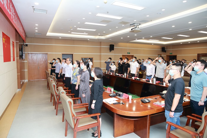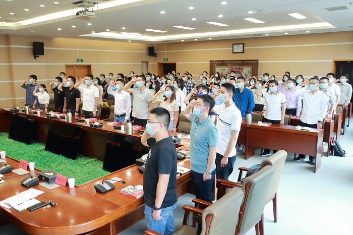 新入职教师和与会领导面向国旗庄严宣誓