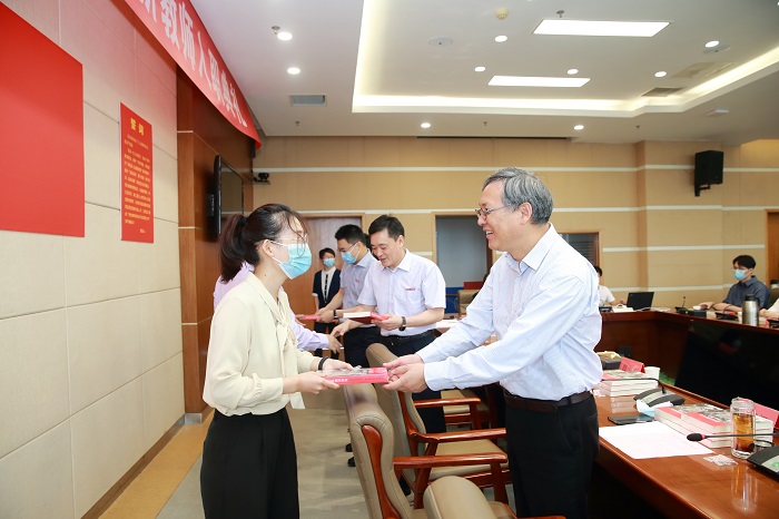校党委书记刘祖汉、副校长魏少华为新入职教师发放校徽、赠送书籍