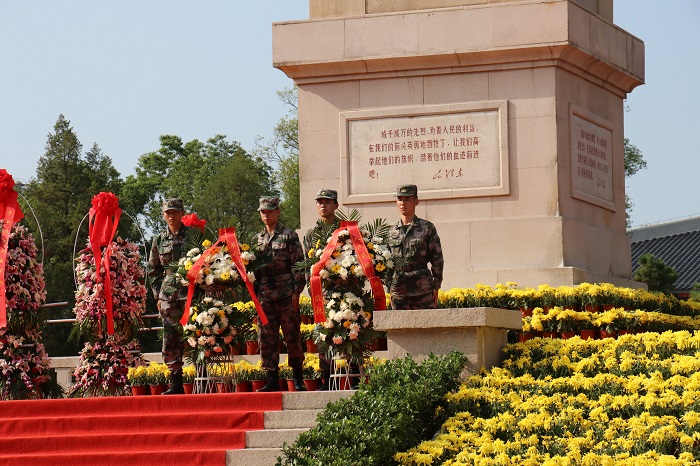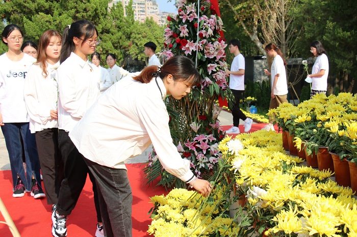 在雄壮的国歌声中,仪式正式开始,全体师生肃立,缅怀英魂。校国旗护卫队队员迈着整齐的步伐向烈士敬献花篮。邵荣缓步走到纪念碑前,仔细整理花篮缎带。鲜花敬献英灵,伟业告慰先烈。全体师生向革命烈士三鞠躬,依次走到烈士纪念碑前敬献鲜花并瞻仰纪念碑,深情缅怀为中华民族伟大复兴事业捐躯的无数先烈。