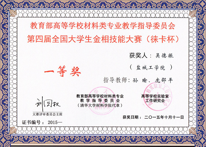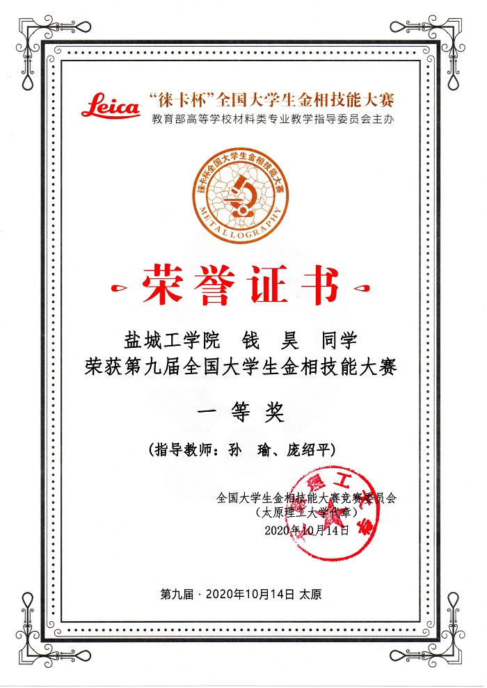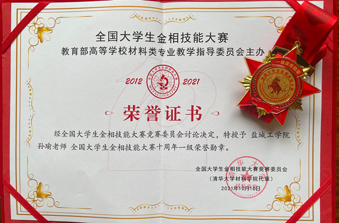 孙瑜老师获得全国大学生金相技能大赛十周年一级荣誉勋章
