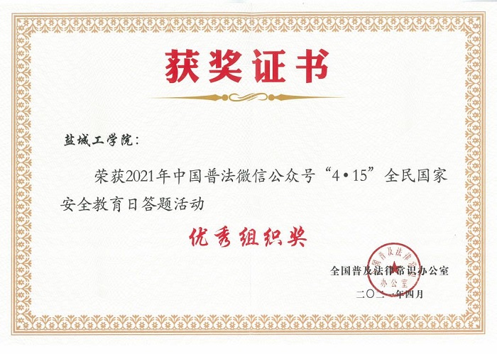 近日,全国普及法律知识办公室授予贝博2021年中国普法微信公众号“4·15”全民国家安全教育日答题活动、2021年中国普法微信公众号“美好生活·民法典相伴”主题教育答题活动和2021年中国普法微信公众号专项答题活动“优秀组织奖”荣誉称号。
