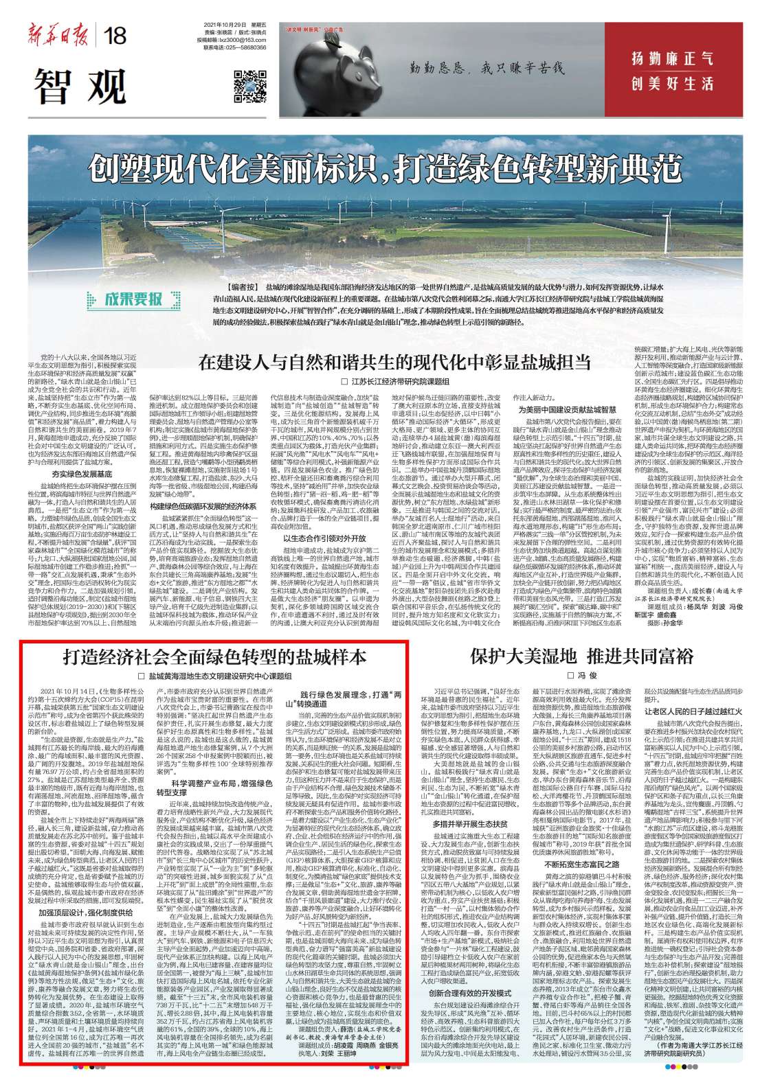 10月29日出版的《新华日报》(第18版)以“创塑现代化美丽标识,打造绿色转型新典范”为总标题整版刊发了贝博盐城黄海湿地生态文明建设研究中心与南通大学江苏长江经济带研究院合作研究的三篇阶段性成果,其中《打造经济社会全面绿色转型的盐城样本》为贝博盐城黄海湿地生态文明建设研究中心课题组研究成果。