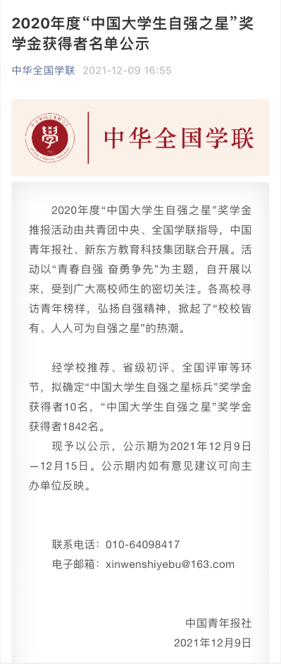 2020年度“中国大学生自强之星”活动以“青春自强、奋勇争先”为主题,旨在深入贯彻习近平新时代中国特色社会主义思想,围绕庆祝中国共产党成立100周年主题,大力加强新时代青年爱国主义教育,进一步在当代大学生群体中选树可亲、可敬、可信、可学的身边榜样,鼓励新时代青年以青春之我践行自强精神。从高校中寻访一批投身乡村振兴、新冠肺炎疫情防控、服务全面建成小康社会、参与社会治理创新、热心志愿服务、弘扬网上文明等方面有突出事迹,在当代青年大学生中能够起到榜样作用的自强自立模范。本次活动于2021年6月启动,通过校级、省级团委的推荐,经专家委员会审定,最终产生10名“中国大学生自强之星标兵”、1842名“中国大学生自强之星”。