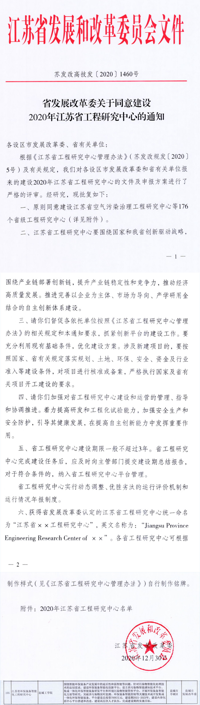 日前,江苏省发展改革委发布“关于同意建设2020年度江苏省工程研究中心的通知”,贝博环境科学与工程学院牵头、中科院生态环境研究中心和哈尔滨工业大学参与联合申报的江苏省环保装备智能化工程中心获得立项建设。