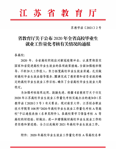 近日,省教育厅发布《关于公布2020年全省高校毕业生就业工作量化考核有关情况的通报》(苏教学函〔2021〕2号),bb贝博艾弗森官方网站成功获得A等。