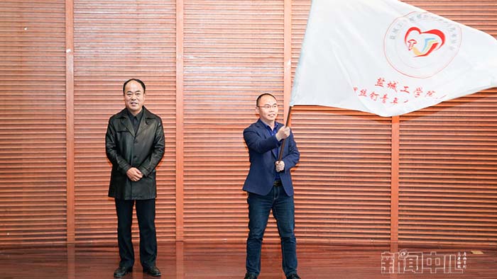 副校长邵荣为螺丝钉青年志愿者协会授旗