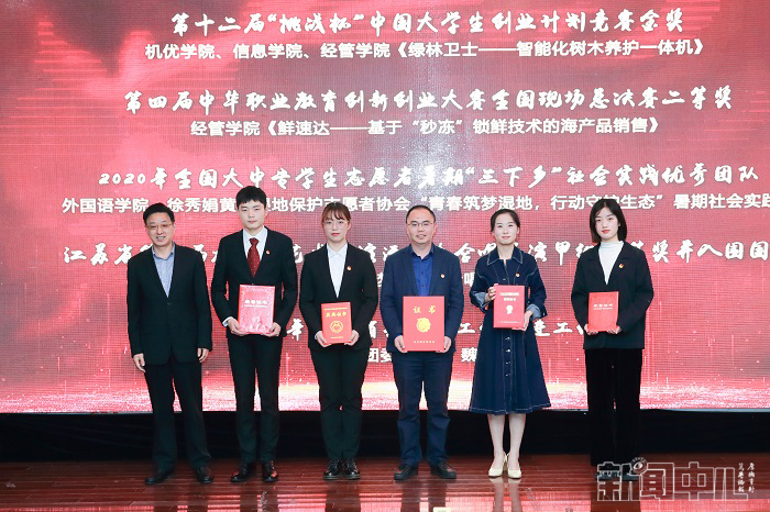 会上,校团委通过视频呈现,回顾总结了2020年学校共青团工作。与会领导分别为2020年度获省级以上表彰的集体和个人、校“五四红旗团委标兵”、“五四红旗团委”和“十佳共青团员标兵”颁发了奖牌和证书。获评2020年度“五四红旗团委标兵”代表、设计艺术学院葛平老师,第12届“挑战杯”中国大学生创业计划竞赛金奖获奖团队代表、经济管理学院Z会计172班金昱彤同学,江苏省“青马工程先锋骨干”学员、校学生会执行主席、土木工程学院B建筑181班韦琰霖同学分别作交流发言。