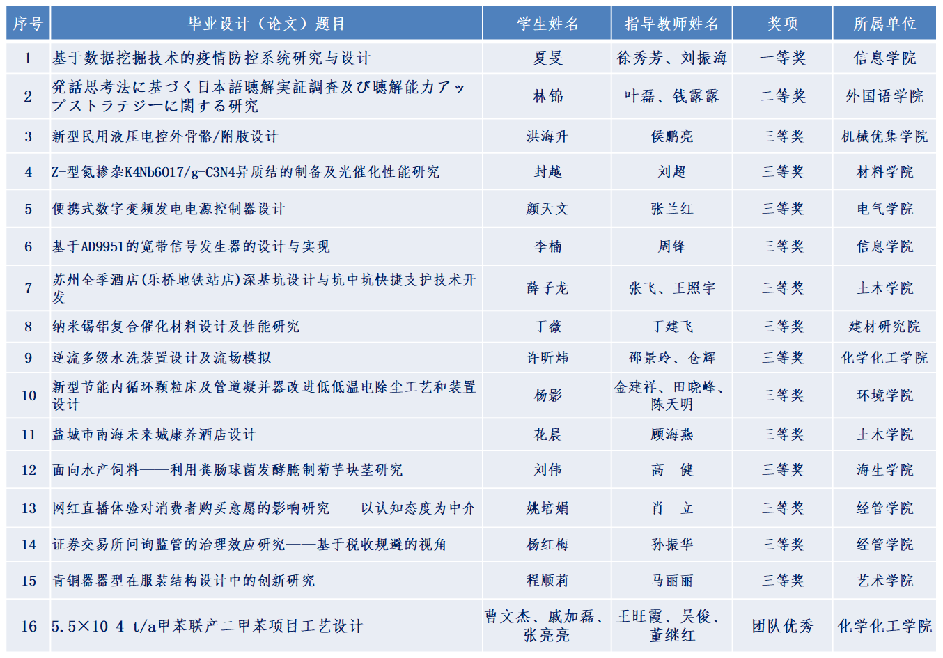 其中,信息工程学院徐秀芳、刘振海两位老师指导夏旻同学的毕业设计“基于数据挖掘技术的疫情防控系统研究与设计”获得一等奖,外国语学院叶磊、钱露露两位老师指导林锦同学的毕业论文“発話思考法に基づく日本語聴解実証調査及び聴解能力アップストラテジーに関する研究”获得二等奖,化学化工学院王旺霞、吴俊、董继红等老师指导曹文杰、戚加磊、张亮亮3名同学获得团队优秀毕业论文(设计)。