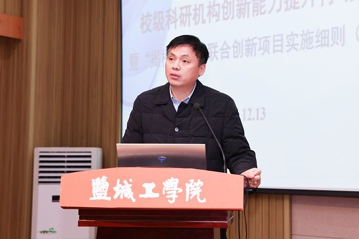 12月13日下午,学校在希望大道校区机械馆报告厅召开“科研机构创新能力提升行动动员会暨“揭榜挂帅”联合创新项目工作布置会”。副校长、盐城市政协副主席丁成主持会议。科学技术处、社会科学处相关负责人,各二级学院、产业技术研究院、高教院院长和分管科研副院长,校级科研机构负责人和智库负责人等参加会议。
