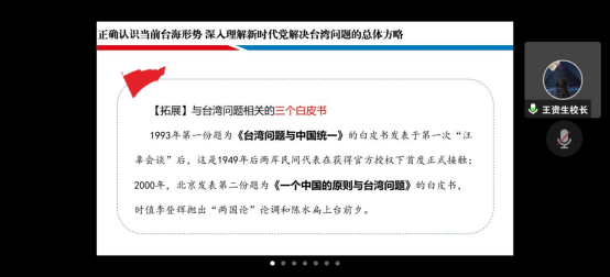 12月13日上午,校党委常委、副校长王资生为Y预科221、Y预科222两个班级学生讲授了《形势与政策》专题七“正确认识当前台海形势,深入理解新时代党解决台湾问题的总体方略”。王资生以两岸关系发展现状引入,分析了在国内国际两个大局都发生深刻变化的时代背景下,推进祖国完全统一面临着新的形势。他指出,实现祖国完全统一,是全体中华儿女的共同愿望,是实现中华民族伟大复兴的必然要求,是中国共产党矢志不渝的历史任务,实现这一目标,需要一系列行之有效的方针、政策、制度。
