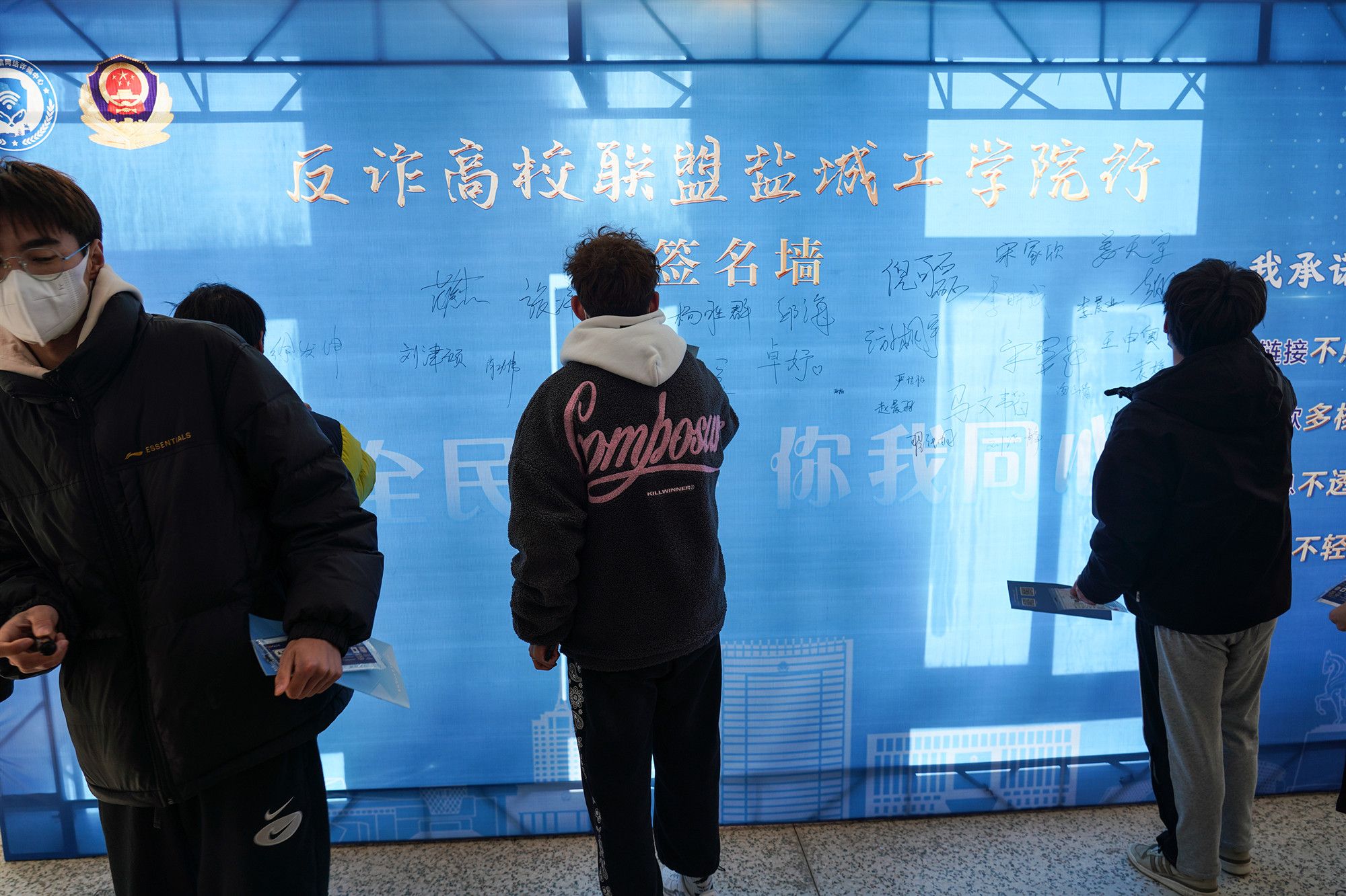 “反诈一直在路上,没有终点”“全民反诈,你我同心”,参会师生表示对诈骗分子手段层出不穷令人痛恨,被骗数据触目惊心令人惋惜,纷纷在签名墙上留了积极参与反电信网络诈骗宣传,共同打击治理电信网络诈骗犯罪的意愿,推进贝博“无诈校园”建设工作的决心。