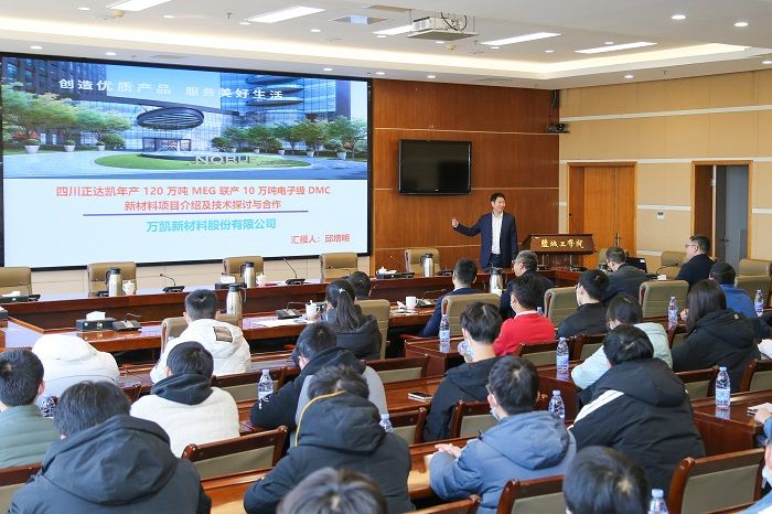 仪式后,邱增明向与会教师介绍了四川正达凯新材料有限公司年产120万吨 MEG 联产10万吨电子级DMC新材料项目情况,具体阐述了工艺技术方案、工艺流程以及化学反应过程,重点强调了工艺技术先进性和技术难点。