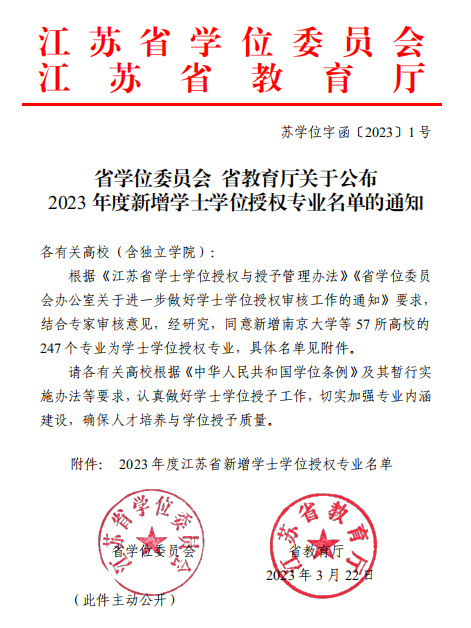 近日,江苏省学位委员会和江苏省教育厅下发《关于公布2023 年度新增学士学位授权专业名单的通知》(苏学位字函〔2023〕1号),贝博新增的能源化学、应用统计学、光电信息科学与工程、智能装备与系统、数据科学与大数据技术5个专业获批为学士学位授权专业。