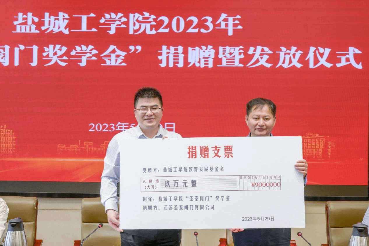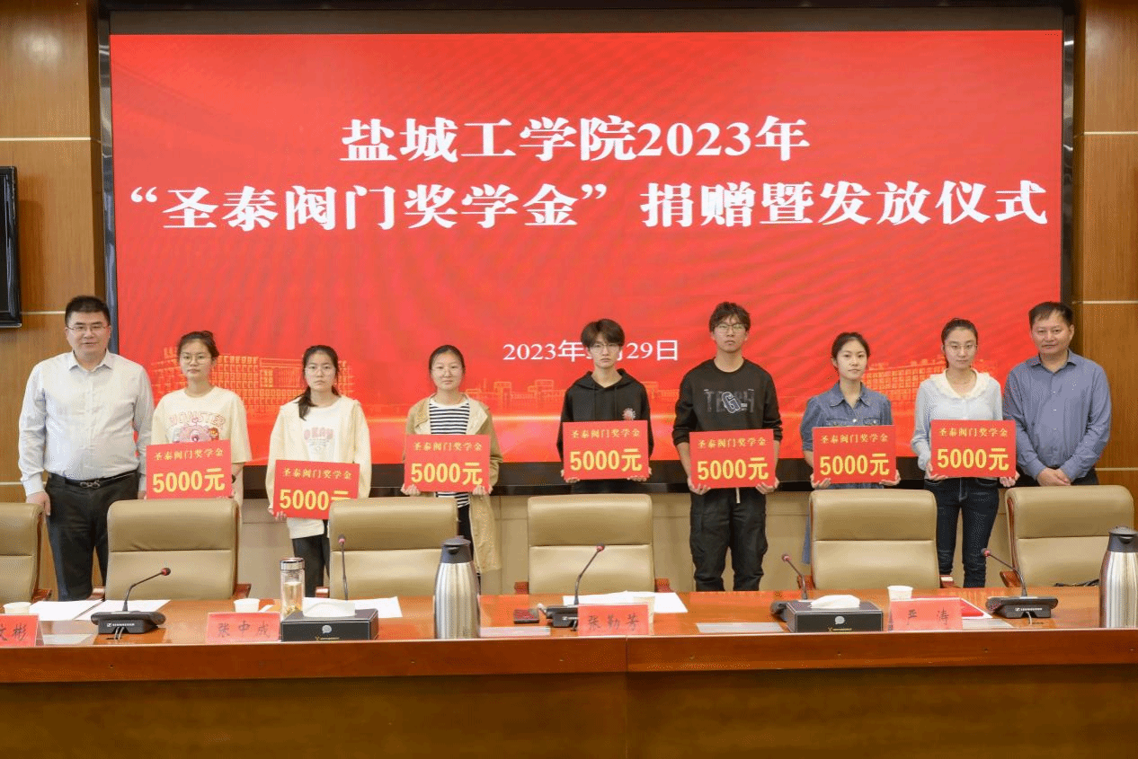 张勤芳代表学校接受江苏圣泰阀门有限公司捐赠的奖学金并颁发捐赠证书。他对圣泰阀门积极致力公益事业、帮困助学的行为表示感谢,对获得奖学金的20位品学兼优的同学表示祝贺。他勉励获奖学生要志存高远、脚踏实地,以优异的成绩回报爱心人士的殷切关怀,做优异出彩的“盐粒子”;要勇于开拓、顽强拼搏,争做追求幸福的奋斗者;要学会做人、心怀感恩,以奉献精神和实际行动积极回报社会,争做乐于助人的奉献者。