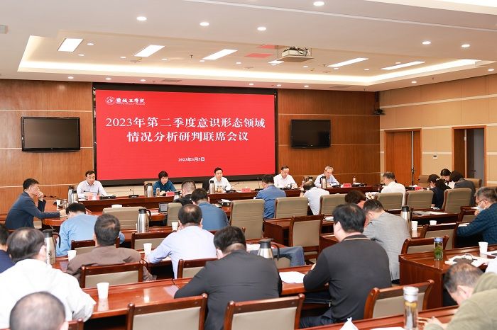 6月5日上午,学校在希望大道校区行政楼9楼视频会议室召开2023年第二季度意识形态领域情况分析研判联席会议。党委副书记薛浩出席并讲话。党委常委、党委统战部部长姚军,党委常委、党委组织部部长邢晓平出席。党委常委、党委宣传部部长奚新国汇报第二季度全校意识形态工作情况,对近期出现的舆情风险进行分析研判并布置下一阶段的重点工作。党委宣传部副部长刘荣主持。