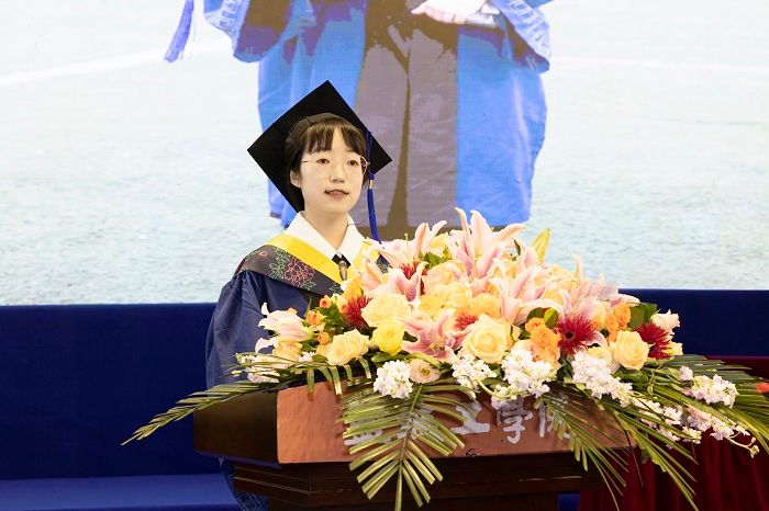 会上,考取华东理工大学博士研究生、化学化工学院Y化工201班刘宴秀同学,考取徐州市选调生、经济管理学院B国贸191班高甜甜同学,塔吉克斯坦籍留学生、信息工程学院Z计算机191班高兴同学,国家自然科学基金获得者、“挑战杯”国赛项目指导教师、机械优集学院卢倩博士分别代表研究生、本科生、留学生和教师发言。刘宴秀说:“盐工铁军精神的红色烙印不会随着毕业而褪色,它将会跟随我们的足迹遍布大江南北,伴随一生。”高甜甜说:“我们有幸遇见最好的盐工,在盐工邂逅最美的青春,未来将以奋斗姿态激扬青春,乘时代东风奔赴下一场山海!”高兴说:“我会用我自己的力量为祖国发声,为盐工发声,为中国发声,为中塔友谊与发展,贡献绵薄之力!”卢倩说:“希望同学们坚守诚信、为人正直,坚持梦想、主动作为,独立思考、乐观自信。”