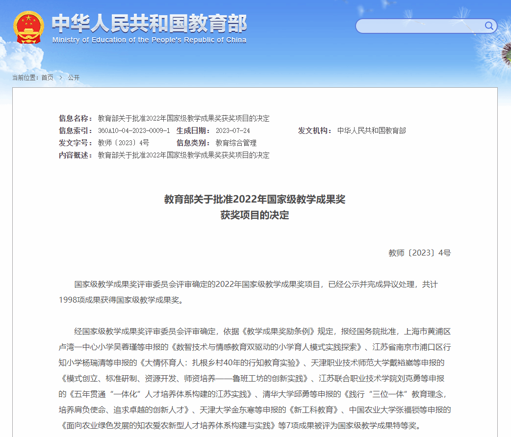 国家级教学成果奖是由教育部设立的教育教学研究和实践领域的最高奖,每四年评审一次,是与国家自然科学三大奖并列的国家级奖项,获奖成果代表了我国教育教学工作的最高水平,是彰显学校人才培养工作水平和教育教学改革成果的核心指标,也是国家加快建设教育强国、落实立德树人根本任务的重要举措,是对学校人才培养工作和教育教学改革成果的检阅和展示。