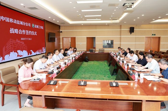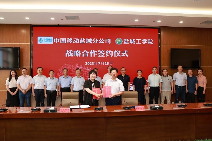 党委常委、副校长王资生与盐城移动公司党委委员、副总经理王俊代表双方签约。盐城移动公司党委委员、副总经理郭大干,盐城移动亭湖中心总经理李军,以及双方相关职能部门负责人参加签约仪式。