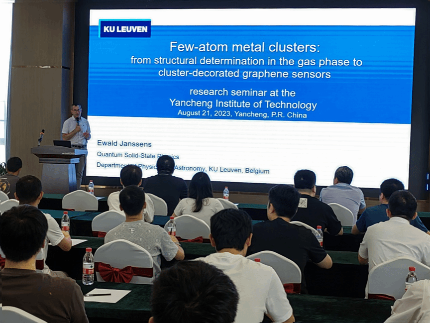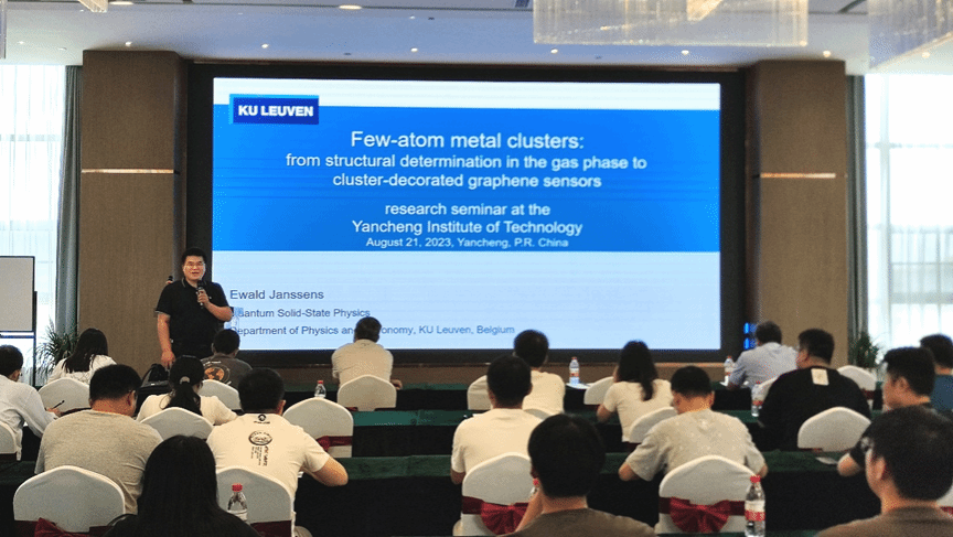 21日上午,在盐龙湖先进技术研究院,Ewald Janssens教授作了题为“Few-atom metal clusters: from structural determination in the gas phase to cluster-decorated graphene sensors”的学术讲座,从金属团簇的结构及应用展开,重点介绍了红外光谱识别孤立金属团簇的几何形状及在碰撞池中的尺寸依赖性及化学反应性;应用红外光谱研究反应中间体以及团簇-富勒烯配合物的结构;以及用原子数精确的金团簇装饰的石墨烯器件可以用作传感平台来量化分子吸附和解吸过程的能量学。Ewald Janssens教授还介绍了比利时荷语鲁汶大学(KU Leuven)及物理与天文学院,希望以双方签订的共建国际联合实验室合作协议为契机,欢迎大家参观访问比利时荷语鲁汶大学。会后相关科研人员与Ewald Janssens教授进行了深度的交流。产业技术研究院专任教师、其他院系相关专业师生、盐龙湖先进技术研究院外国专家等50余人参加报告会。