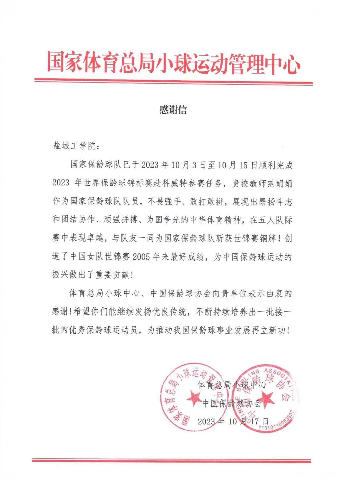 近日,国家体育总局向学校发来感谢信。信中指出,国家保龄球队已于2023年10月3日至15日顺利完成2023年世界保龄球锦标赛赴科威特参赛任务,贝博教师范娟娟作为国家队队员,不畏强手,敢打敢拼,展现出昂扬斗志和团结协作、顽强拼搏、为国争光的中华体育精神,在五人队际赛中表现卓越,与队友一同为国家保龄球队斩获世锦赛铜牌,创造了中国女队世锦赛2005年来最好成绩。