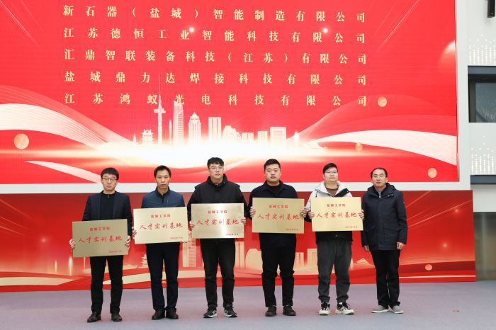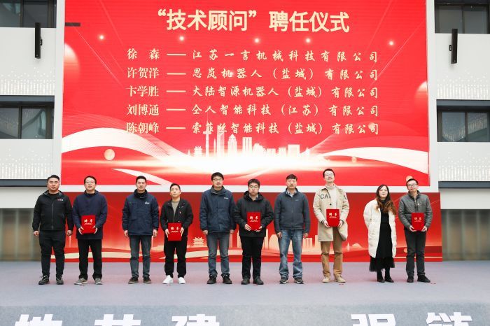 丁成代表学校为第一批 “bb贝博艾弗森官方网站人才实训基地”——新石器(盐城)智能制造有限公司、江苏德恒工业智能科技有限公司、汇鼎智联装备科技(江苏)有限公司、盐城鼎力达焊接科技有限公司、江苏鸿蚁光电科技有限公司等5家企业授牌。江苏一言机械科技有限公司、思岚机器人(盐城)有限公司、大陆智源机器人(盐城)有限公司、仝人智能科技(江苏)有限公司、索菲丝智能科技(盐城)有限公司负责人向贝博徐森、许贺洋、卞学胜、刘博通、陈朝峰等5位教授、博士颁发“企业技术顾问”聘书。