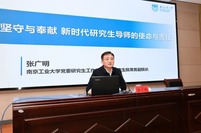 会议邀请国家教学名师、南京工业大学张广明教授作题为《坚守与奉献—— 新时代研究生导师的使命与责任》的首场专家辅导报告。他从教育本质与教师情怀、面向未来的研究生教育改革、如何成为一名优秀的研究生导师三个方面细致讲授,深刻阐述了导师的使命与责任,为如何做好新时代研究生导师指明了方法和路径。他指出,研究生导师是高校学科建设和人才培养的关键力量,是科技创新的战略力量,要立德树人、科研育人、以文化人,成为研究生学术道路、价值塑造的引路人。