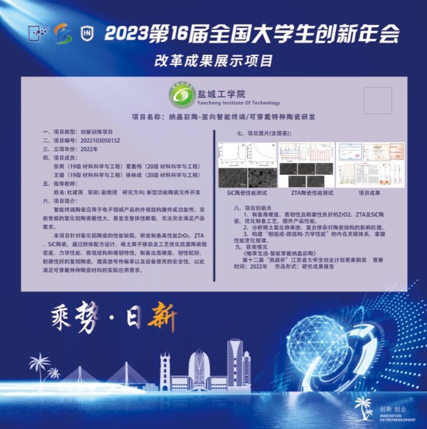 江苏省入选本届年会项目14个,贝博材料学院杜建周、罗驹华老师指导,19级本科生张雨、王璐主持,20级本科生夏嘉伟、徐林成参加的《纳晶彩陶-面向智能终端/可穿戴特种陶瓷研发》(国创计划,No.202210305015Z)入选。