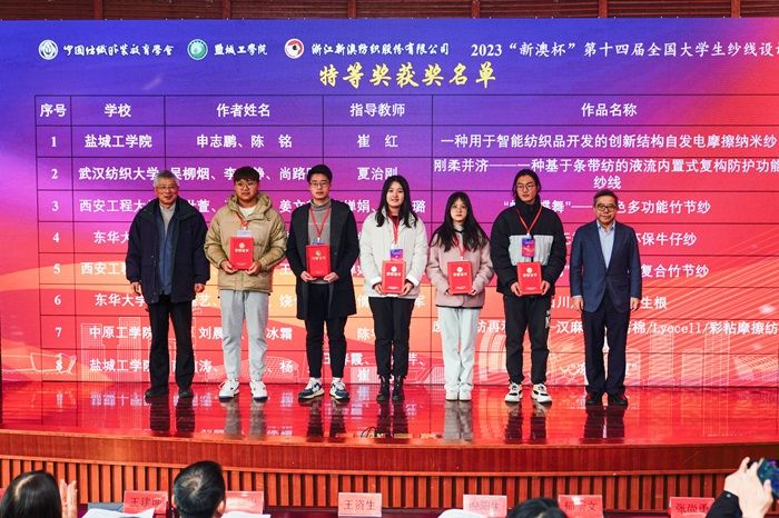 12月24日,由中国纺织服装教育学会主办,浙江新澳纺织股份有限公司冠名,bb贝博艾弗森官方网站承办的“新澳杯”第十四届全国大学生纱线设计大赛综评暨颁奖大会在贝博希望大道校区润美楼成功举办。校党委常委、副校长王资生,中国纺织服装教育学会会长倪阳生、教育部高等学校纺织类专业教学指导委员会主任郁崇文,浙江新澳纺织股份有限公司副董事长华新忠等来自东华大学、天津工业大学、江南大学、西安工程大学、武汉纺织大学、江苏悦达纺织集团有限公司等纺织院校和企业的教授专家,贝博教务处处长余晓红、纺织服装学院党总支书记宋孝浜出席。各兄弟高校的师生代表参加,贝博纺织服装学院院长王春霞主持。